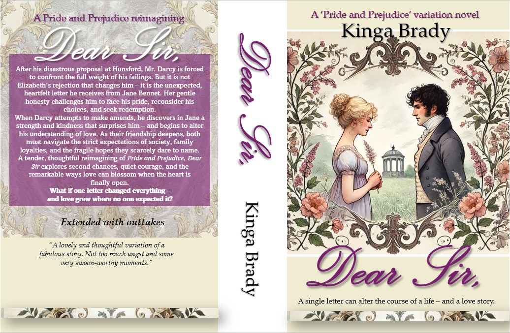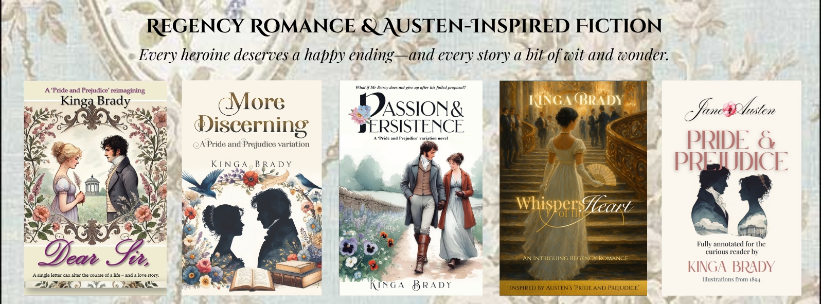 Hello and welcome to my website! My name is Kinga Brady and I am a writer specializing in Pride and Prejudice Variation novels and regency romance novels. I am based in the UK, but my stories take readers on journeys to different places and time periods.